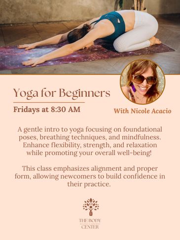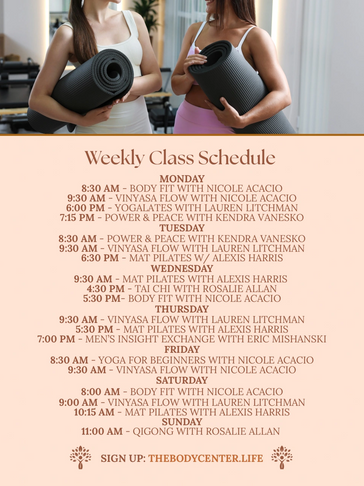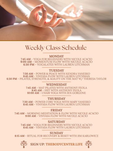 Find your flow and fuel your wellness with our diverse weekly class offerings at The Body Center. From energizing yoga flows and grounding meditation to core-strengthening sessions and restorative practices, there’s something for every body and every level.