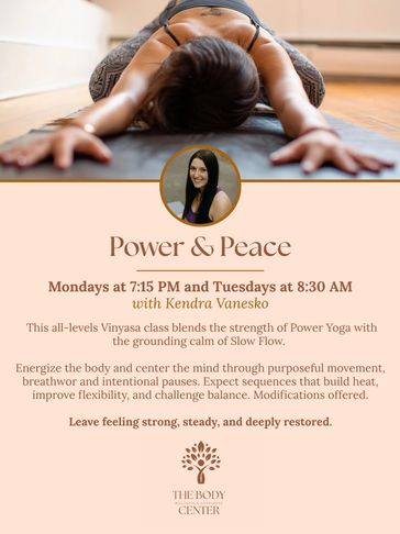 Power & Peace energizes the body and centers the mind through purposeful movement, breathwork, and intentional pauses. Expect sequences that build heat, improve flexibility, and challenge balance.