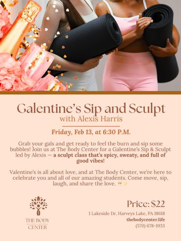 Grab your gals and get ready to feel the burn and sip some bubbles! Join us at The Body Center for a Galentine’s Sip & Sculpt led by Alexis — a sculpt class that’s spicy, sweaty, and full of good vibes.