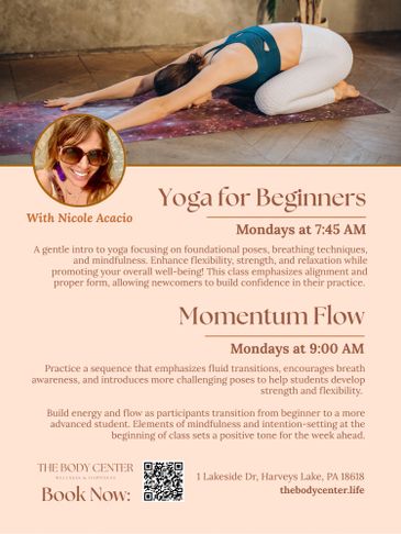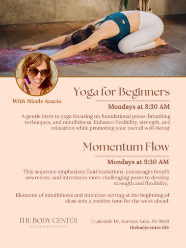 Find your flow and fuel your wellness with our diverse weekly class offerings at The Body Center. From energizing yoga flows and grounding meditation to core-strengthening sessions and restorative practices, there’s something for every body and every level.